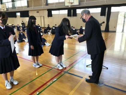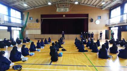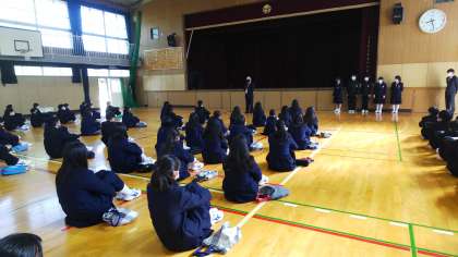 ダンス部の表彰と校長先生のお話。校長先生からは「人権」についてのお話でした。生活指導の吉田先生からは「小規模校の良さを生かしていこう」というお話でした。