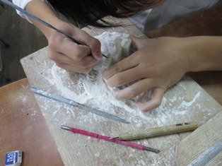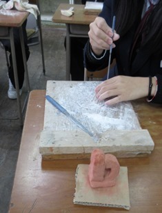 まず、主題(自分のテーマ)が決まったらそれを形にしてテラコッタ粘土で短時間で形にします。最初から立体の彫像では難しいのでまずは、粘土で塑像を作り、それをモデルに石を篆刻刀や細工ヤスリで彫っていきます。一心に石を彫ることは気持ちを落ち着かせることにも効果があります。
