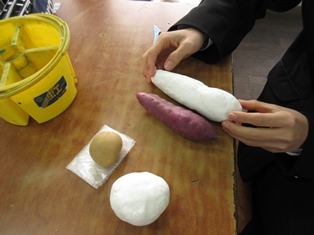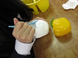黄色いパプリカ(1年1組澤埜さん)や変わった形のさつまいも(1年1組乾さん)など塑像にぴったりのモチーフを選んでいます。枝光君、大原君はは2つ目の作品にも挑戦しました。