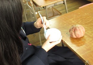 美術科1年生の冬の教材は紙粘土で野菜や果物をそっくりに作ります。まさに3Dデッサンです。