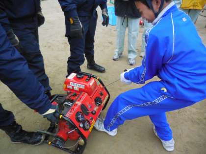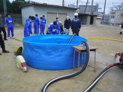 まず、水槽にホースがつながっているポンプのモーターエンジンをかける訓練をしました。エンジンをかけるのが難しく、生徒は悪戦苦闘していました。