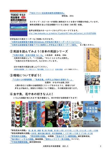 大阪市立図書館 電子書籍 EBSCO eBooksアクセス制限なし中学生むけ英文リーダーご案内」 をご覧ください。