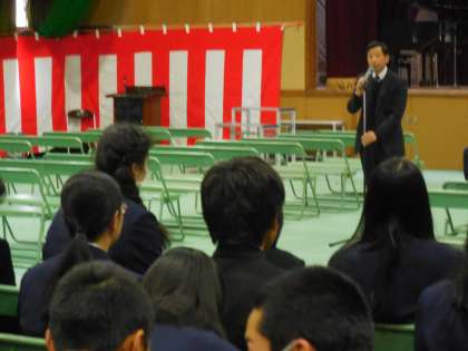 学校長より4年前はちょうど大阪市の中学校の卒業式の日でした。未曾有の大震災が起こり、これまでに見たことのない津波の映像や被災の状況に驚かされたこと、1万5千人以上の人が亡くなられ、今なお不明の人々がおられること、福島の原発事故の影響もまだまだ続いていること・・・のお話があり、全員で黙祷を捧げました。