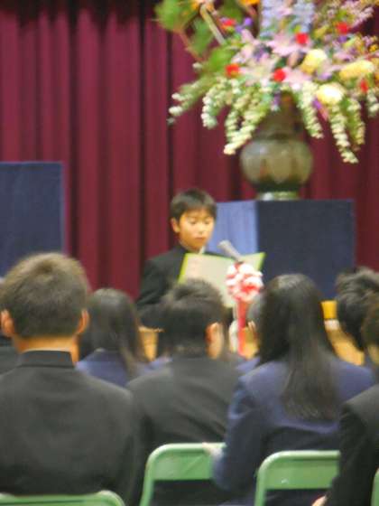いよいよ、3年生の答辞です。森さんの力強い言葉に3年のみならず会場内は3年間が目の前に繰り広げられたような面持でした。周囲の人たちに対する感謝の言葉がこもった印象に残る答辞でした。