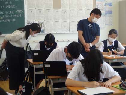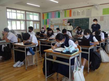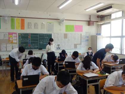 生徒17人に対して、先生は4人です。築港中学校では決まった授業形態が亜ありません。習熟度別3分割や単純2分割(または3分割)等。