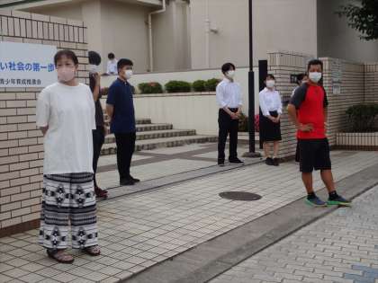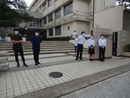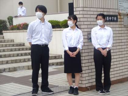 朝の登校指導の様子です。8時25分の予鈴前には全生徒の登校が完了しています。