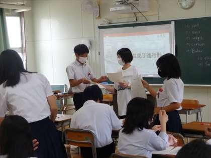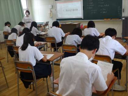 3年生英語の授業は、実力テストの解答の確認です。がんばった結果はどうだったでしょう。