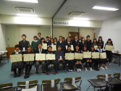 3月24日、「地域の防犯キャンペーン活動に参加し演奏を通じて活動を盛り上げるとともに生徒代表が安全宣言をするなど地域住民の防犯意識高揚に多大な貢献をされました」として吹奏楽部が、大阪府夕陽丘庁舎で行われた「平成26年度善行少年表彰式」で表彰されました。これには吹奏楽部の部長、副部長の3名が代表として参加しました。