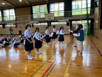 校長先生、吉田先生のお話のあと、今年度第1回の英語検定の合格証書が届きましたので、伝達を行いました。