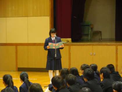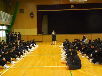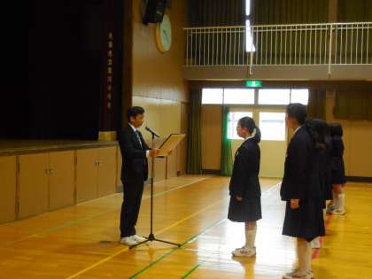 始業式の後、「地域の防犯キャンペーン活動に参加し演奏を通じて活動を盛り上げるとともに生徒代表が安全宣言をするなど地域住民の防犯意識高揚に多大な貢献をされました」として吹奏楽部に「平成26年度善行少年表彰状」の伝達がありました。