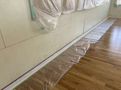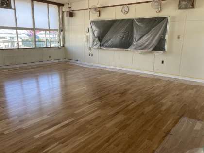 もう工事が終了したのかなと思っていたら、「巾木(はばき)」と呼ばれる部分の塗装が行われていました。相変わらず、真新しい床に、外からの光が反射していますね。