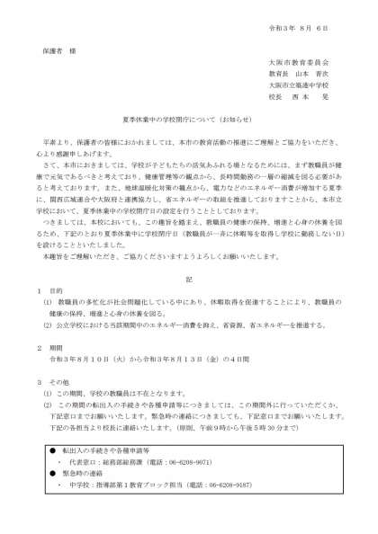 今年度の夏季休業期間中の閉庁日を8月10日(火)〜13日(金)とさせていただきます。詳細については、 築港中 夏季休業中の学校閉庁について(お知らせ) をご覧ください。