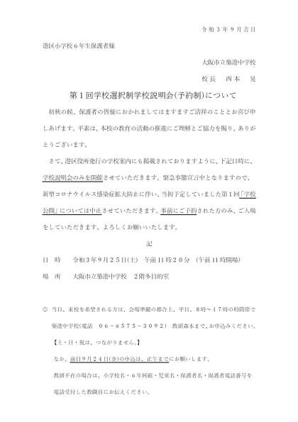 当日、来校を希望される方は、会場準備の都合上、前日9月24日(金)の正午までに築港中学校(電話 06−6575−3092) 教頭 森本 まで、お申込みください。