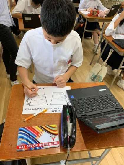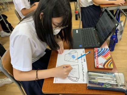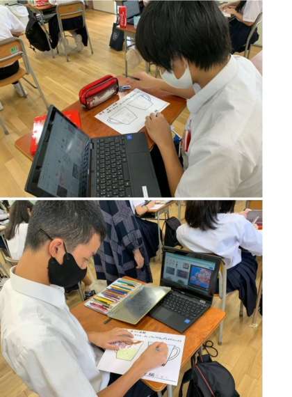 修学旅行で陶芸づくりをします。マグカップ絵付けデザインの作業中です。