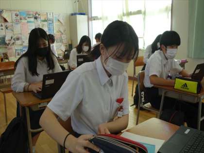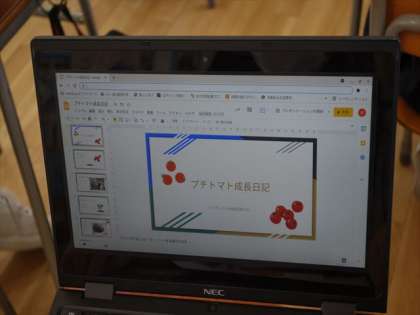 土曜授業の3年生の技術を見ました。栽培領域で育てたミニトマトの記録をパワーポイントを使ってまとめています。最後は、プレゼンテーションをします。