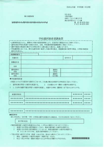 写真は、学校選択制希望調査票 学校選択制希望調査票 見本 を掲載しています。