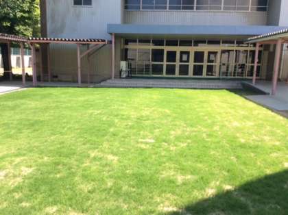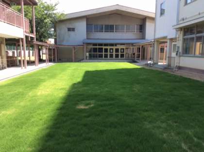 写真は、体育館前の中庭が美しい芝生広場になってきた様子です。