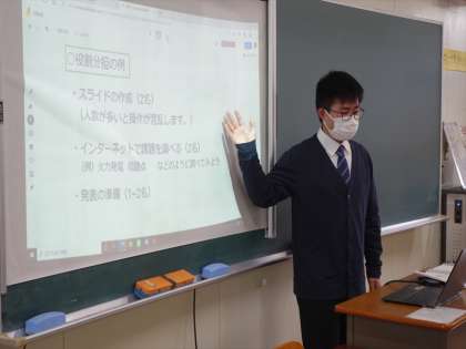 「運動とエネルギー」エネルギー資源とその利用について、グループ学習に取り組みました。各班で分担を決め、自分の役割を責任をもって果たす。最後にはプレゼンテーション。