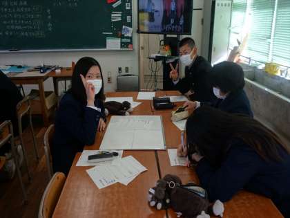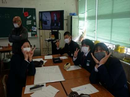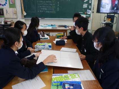 美術は研究授業です。「ポスターの制作」今日は、社会生活や学校生活の中で課題を見つけ、問題意識を持つ。グループ活動や全体での発表を通して、自分の考えを表現する。さあ、どんなポスターができるか?期待してください。