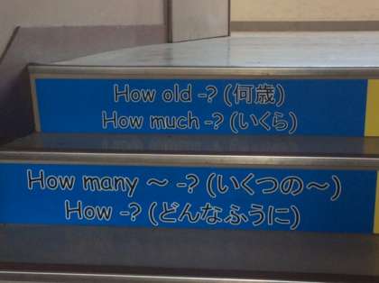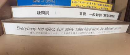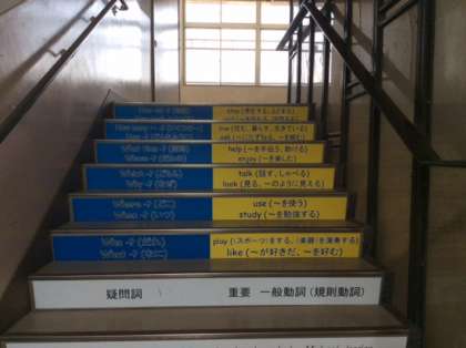 校内の階段(西側−英語バージョン、東側−漢字バージョン)を利用して、楽しく学習できます。ぜひ、HPでも一緒に学習してください。