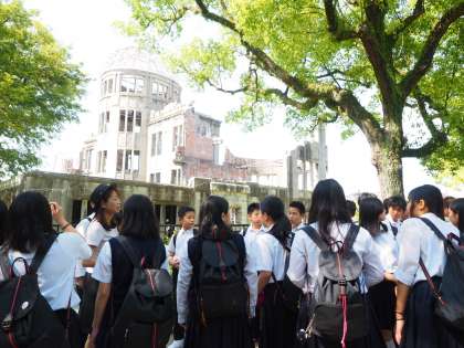 平和記念公園に到着後、原爆ドーム前でガイドさんの話を聞き、そのまま記念写真をクラスごとに撮影しました。