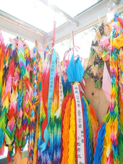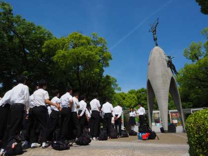 その後、原爆の子の像に向かった一行は像の前で鎮魂セレモニーを行い、千羽鶴を奉納と平和の鐘の音とともに黙祷を捧げました。