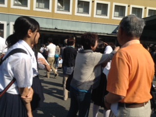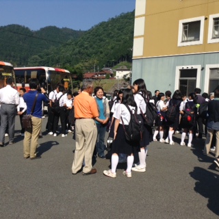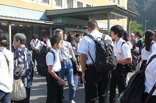 退村式後に、駐車場で民泊家庭の方々と最後の挨拶の様子です。