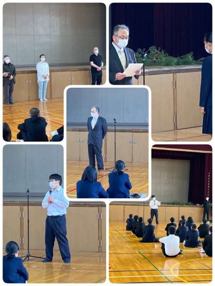 「知・徳・体のバランスのとれた総合的な学力の向上を目指しましょう。今日はオリエンテーションがあり、その中で各学級の委員会や係を決めると思いますが、積極的に自主的にやりましょう。中学校時代に色々な事にチャレンジしましょう。」