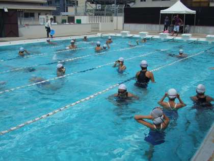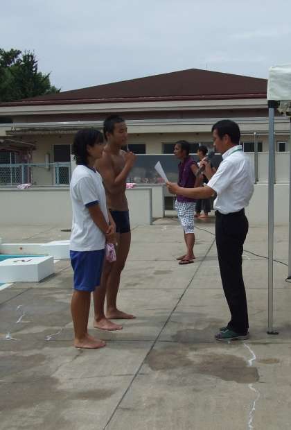 体育館での準備体操を終え、個人種目はそれぞれががんばっていました。前半では本当に僅差、1点差で1組がリードしていました。体育科が趣向をこらした宝探しは2組が勝ちました。リレーではさすが3年生らしい力泳で、とくにバタフライは迫力がありました。