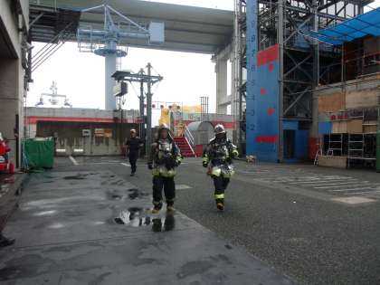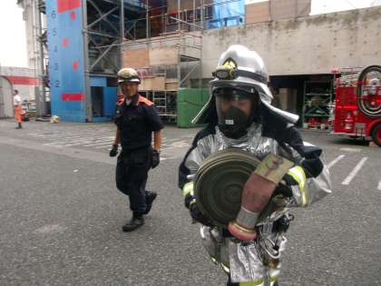 水上消防署では、防火服を着させてもらい、その重さを体感しました。とっても重くて、走るのも一苦労です。