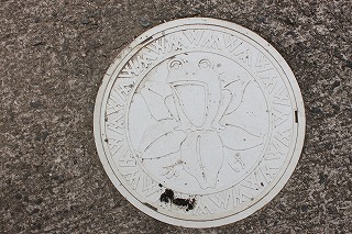 安芸太田町加計地区のマンホールの蓋です。モリアオガエルの柄になっています。