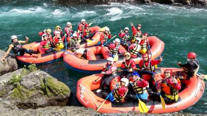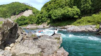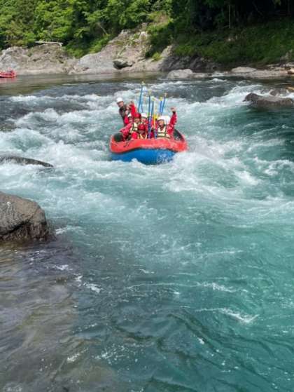 引率の先生も、思い出に残る写真のために体を張っています。急流でのベストショット。