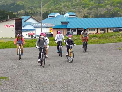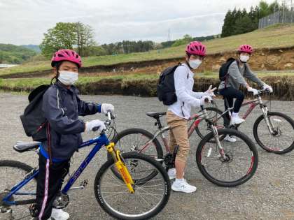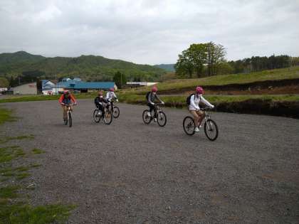 選択体験のマウンテンバイクチームです。高地に行く前に、まずは平地でしっかりとレクチャーを受けています。