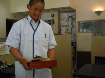 かどやでは、ホール係です。「お待たせしました!ざるそば一丁!」