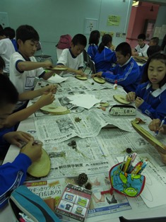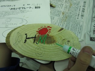 入所式が終わり、部屋に荷物を置いたら再度大研修室に集まって、クラフト制作です。木をスライスチップに自分の名前をデザインしてピットデコというアクリル絵の具で描いていきます。オリエンテーリングで拾ってきた枝や木の実をボンドで貼り付けていきます。ピットデコは5色で1本ずつしかないので班員で分け合って使います。みんな工夫を凝らして思い思いの作品を作っていました。この作品は文化祭で展示します。