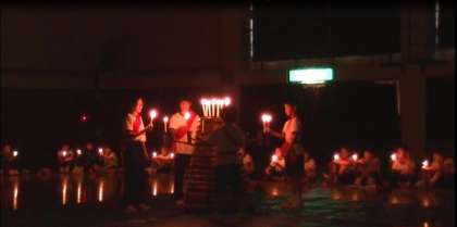 一泊移住のクライマックス、キャンドルファイヤーです。レク係が「火の子」や「火の司」を務めました。火の神は教頭先生です。真っ暗な中でまずは、校歌の合唱から始まり、厳かなセレモニーと続きます。学級委員からそれぞれのクラスへ小さな火は順番にともされていきます。炎の力は不思議な物で回りを暖かい雰囲気に包みます。