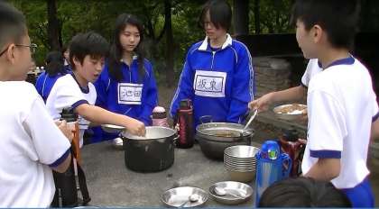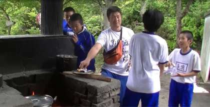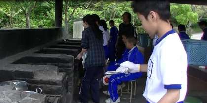 楽しみにしていた野外炊飯です。事前指導がバッチリだったので積極的にみんな各係に取り組みます。マキに火をつけて調理するということは日常生活の中で経験できません。かまど係はどの生徒も興味芯々です。中にははお鍋が焦げ付いてしまって後片付けの時に苦労している班もいましたが、責任をもって黒焦げの鍋と格闘していました。どの班もおおむねおいしいカレーが出来上がったようです。
