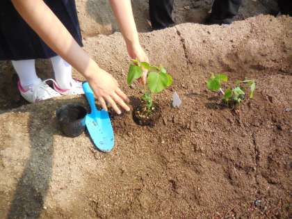 種から育てた苗もすくすくと育ち、いよいよ定植です。楽しく植え付けをしていました。収穫が楽しみです。