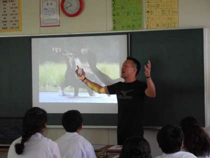 C−NETタイラー先生の授業が始まりました。最初の授業はタイラー先生の自己紹介で、カナダの様子や文化を写真を見せながら話して、生徒は食い入るように見ながらも、積極的に発言したりと楽しそうに参加していました。後半は生徒がタイラー先生に聞きたい質問を一生懸命今までに習った英語を駆使して、全員が2つ以上質問し、会話を楽しんでいました。会話を終えたときの生徒の表情は、言葉が伝わってとてもうれしそうなのと緊張が和らいでほっとしている表情でした。
