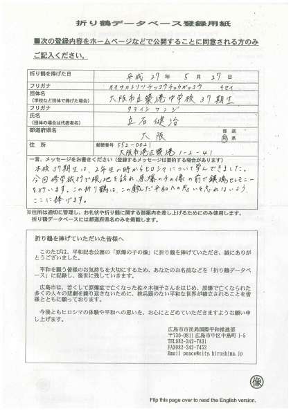 3年生が、修学旅行中の鎮魂セレモニー(6月27日)で奉納した千羽鶴について、大阪に帰ってきてから、広島市の「折り鶴データベース」に登録をしました。