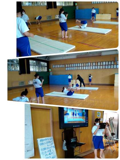 クロームブックや電子黒板を活用して一人一人の動画を撮影して、自分自身の動きを確認しています。。