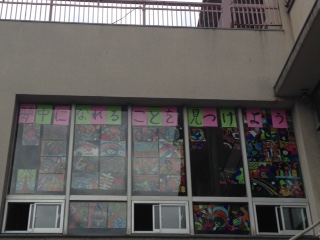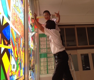 写真は、学校の正門の上に生徒会役員が掲示してくれている様子です。