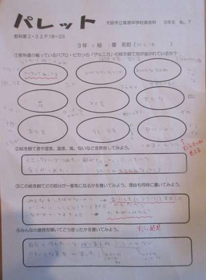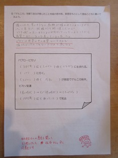 提出したワークシートを読んでみると佐布さんの「傷ついた手、苦しそうな人、動物が描かれているところから、パッと見、すごい残酷そうな絵に見えたけれど、ろうそく(光)の方に生きてる人が向かっていっているところから希望(?)みたいなものも表していると思った。ピカソは絶望の中の希望というものも描きたかったんじゃなかったかなぁと思った。」と書いている。