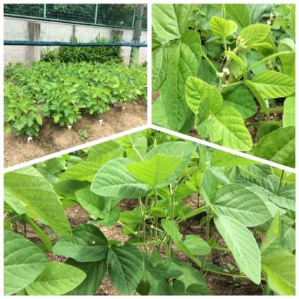 7月9日(木)テニスコート横の畑に植えた枝豆に白い花が咲き始めました。順調に成長しています。時間があれば観察してください。