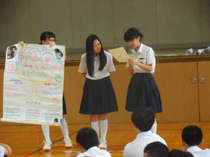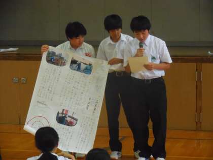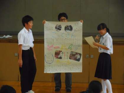 2年生は体育館で、職場体験の発表をしました。みんなの前でマイクを使って発表するのはとても緊張するらしく、モゴモゴとしてしまうシーンもありましたが、立派に発表してくれました。とてもいい経験をしましたね。