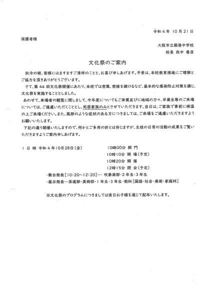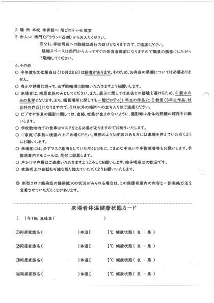 今年度の文化祭も、ご来賓並びに地域の方々、卒業生等のご来場については、ご遠慮いただくこととし、同居家族のみとさせていただきます。