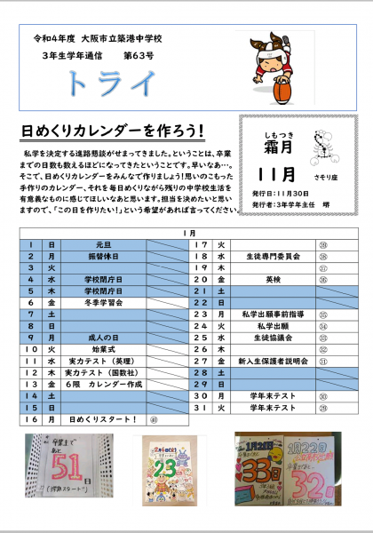 3年生の学年通信に、「私学を決定する進路懇談がせまってきました。ということは、卒業までの日数も数えるほどになってきたということです。・・・」とあります。
