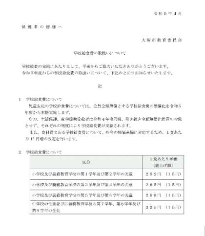 令和5年度学校給食費の取り扱いについて(保護者あてお知らせ)