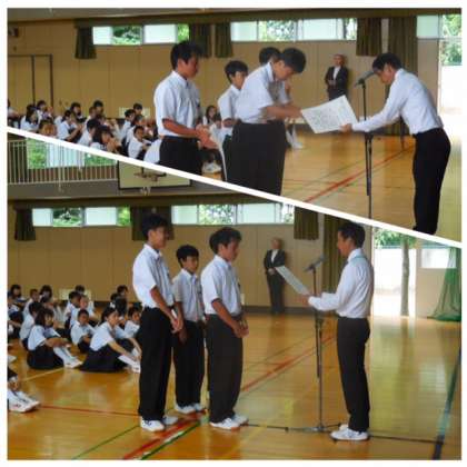 始業式、ブロック大会で取った賞状の伝達がありました。一人ひとり、凛々しく堂々と、賞状を受け取っていました。