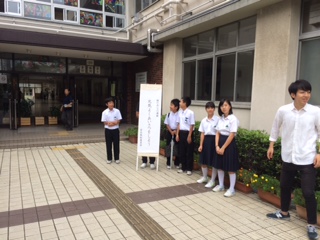 先日の全校集会で呼びかけましたように、安全風紀委員会を中心に生徒会にも協力を得て、あいさつ運動を開始しました。